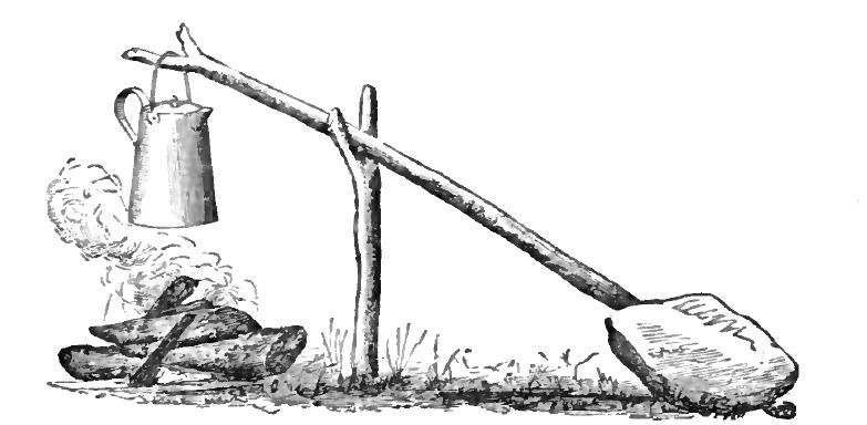 Protection against soot - Hang coffee pots and boilers over the coals. A cooking-arm (above) for hanging a kettle or coffee-pot keeps the tin out of the flames but over the coals where it will be properly heated. A stone or log counterweight depresses one end of the arm, so that the other end from which the bale attaches will properly hang the pot. This is ideal for when only poor-quality cooking wood is on hand or there are no fire dogs.